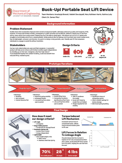 Studies have shown that socialization improves mental and physical health and can ultimately improve quality and longevity of life. However, for those who are mobility impaired, engaging in public activities and maintaining social connections can be difficult. Without an efficient and simple way to raise from a sitting to standing position, this population is often left refraining from participating in social activities and instead remaining home due to the uncertainty that they will be able to stand up again once they sit down. This is a widespread problem as currently up to 6% of seniors in the U.S. are unable to comfortably move to a standing position when seated. Although there are many products marketed as portable seat lift devices, there is a lack of products on the market that are lightweight, compact, and discrete. We intend to create a seat lifting device that is truly portable and easy to use to allow those with limited mobility to be able to attend social activities without a question about if they will be able to stand up from a sitting position, and instead enjoy themselves.
